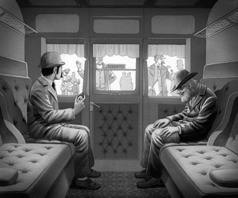 Canterbury. Ilustración para “Sherlock Holmes: More Short Stories”, 2017 Oxford University Press. Holmes y Watson se ocultan de Moriarty, que pasa a toda velocidad como único pasajero del vagón.